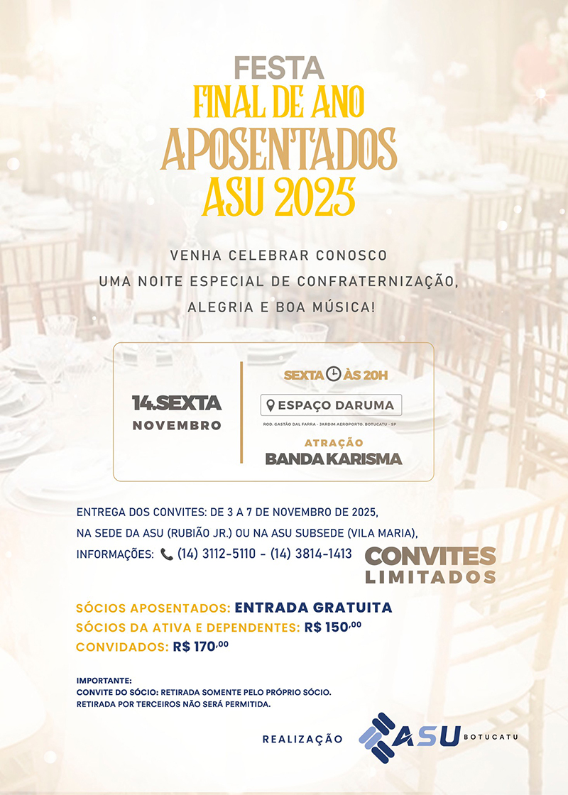 Entrega dos convites: de 3 a 7 de novembro de 2025, na ASU Subsede Cidade, na Vila Maria, Informações: (14) 3814-1413