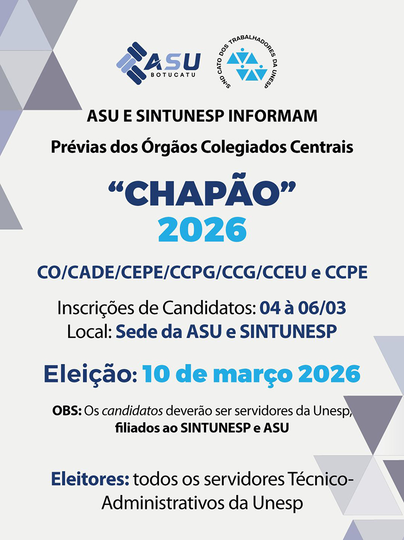 A ASU e o SINTUNESP informam que estão abertas as inscrições para as Prévias dos Órgãos Colegiados Centrais – “Chapão” 2026.